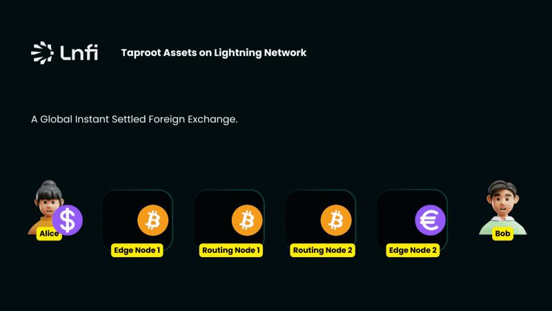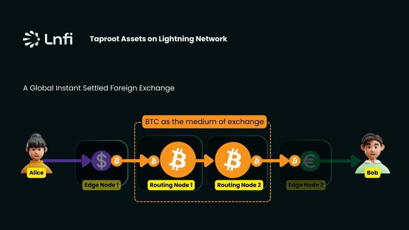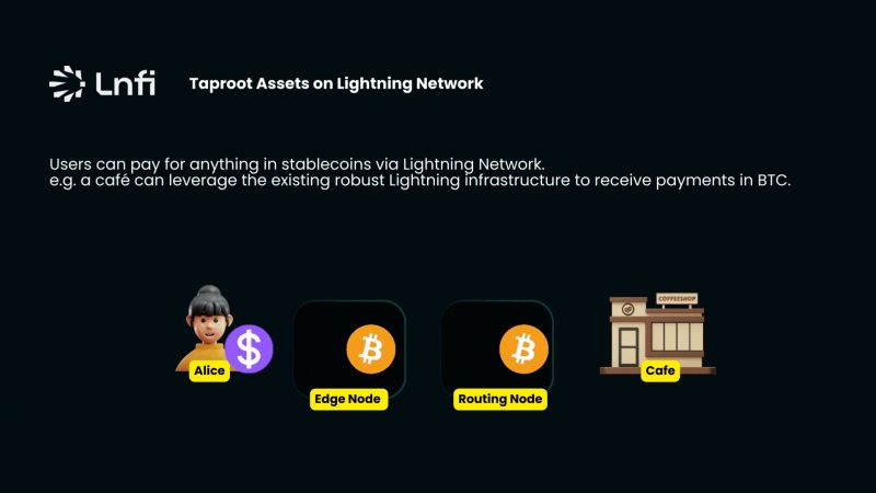 比特币作为路由节点的交换媒介:Taproot Assets 中的稳定币允许比特币在闪电网络中用作交换媒介,如上图所示。这为比特币创造了实用价值。