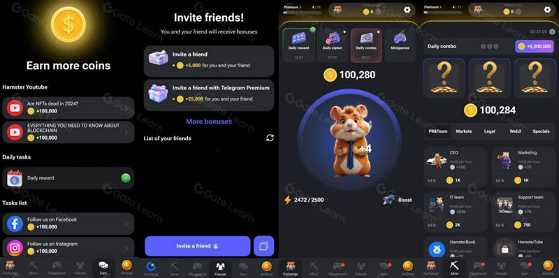 奖励机制:玩家通过参与游戏、完成每日任务、连击和密码解锁等方式,可以获得 $HMSTR **作为奖励,这种“边玩边赚”的机制大大增加了玩家的参与度和用户粘性。