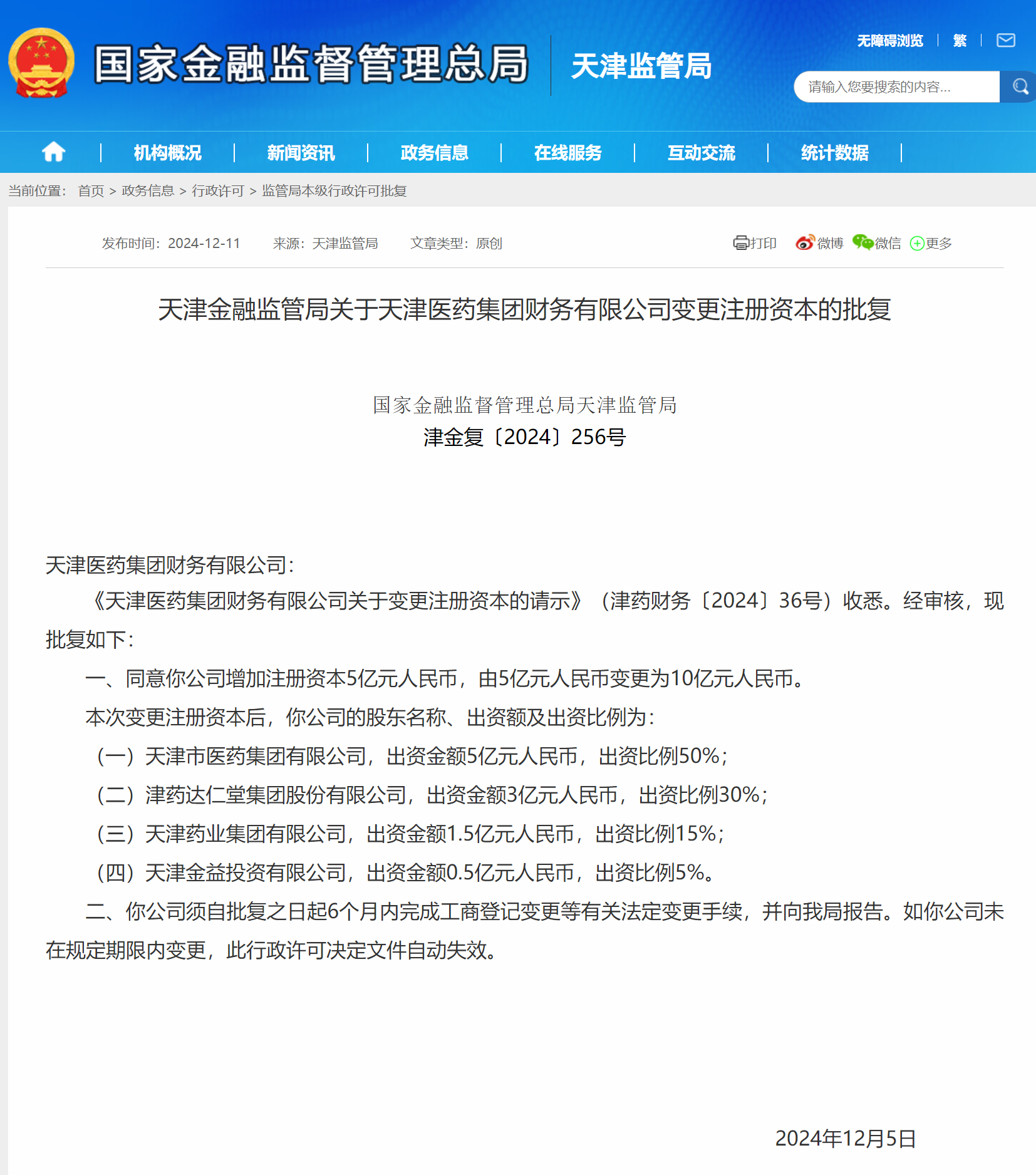 财经12月16日讯 日前,天津金融监管局发布相关批复,同意天津医药集团财务有限公司(简称:天津医药集团财务公司增加注册资本5亿元人民币,由5亿元人民币变更为10亿元人民币。