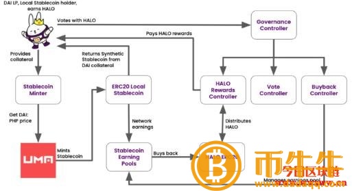 HaloDAO采用UMA协议的去**化的链外数据oracle (Oracle),或称数据验证机制(DVM),发行本地货币,以DAI兑本地区法定货币(如DAI:UBE的PHP)的汇率合成稳定货币,无需链外价格数据传输(无价)合约。