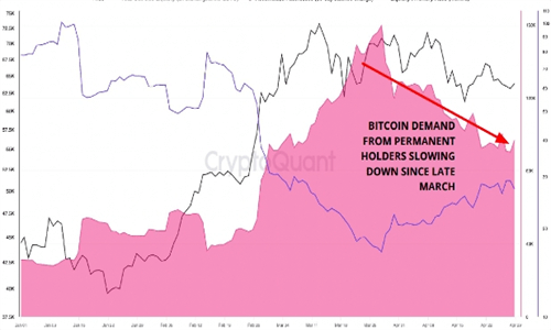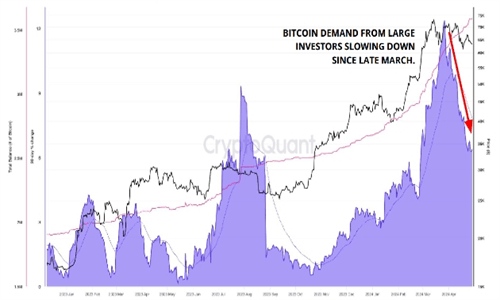 特别值得注意的是,来自**持有者的比特币需求在4月份下降了50%,从3月底的超过20万桶降至约9万桶。这一数据表明,即使在比特币价格高企的时期,那些长期持有者也开始表现出谨慎的态度。