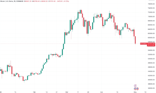 据**数据显示,比特币价格在过去的24小时内下跌了5.42%,并于5月1日创下了新的多周低点,跌至57151美元。分析师们认为,这一下跌趋势可能由多种因素共同作用导致,包括比特币需求的增长放缓、现货比特币ETF需求的放缓以及期货市场空头头寸的增加。