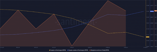 相比之下,原**PEPE的表现则相对稳定。根据CoinMarketCap数据,其价格在过去24小时内仅下跌了1.5%,交易价格为0.000008569美元,市值为36亿美元。市场情绪依然看涨,加权情绪图表也呈现出上升趋势。与PORK不同,PEPE仍面临着较高的购买压力。上周,该模因币在交易所的供应量下降,而在交易所外的供应量增加。