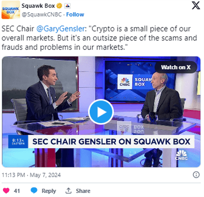 “加密货币只是我们整个市场的一小部分,”Gensler 5 月 7 日在 CNBC 的 Squawk Box 上回答有关美国证券交易委员会的优先事项所在的问题时表示。