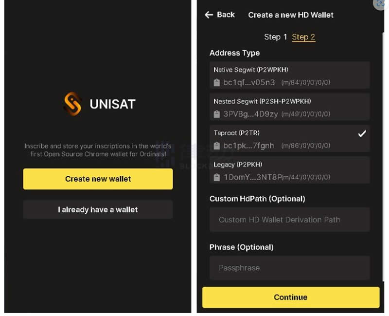 2、在chrome浏览器扩展程序中,打开Unisat插件。新用户在此界面选择「Create newwallet」(创建新钱包)。输入密码注册后会弹出12位助记词,备份助记词,选择后面为 m/86/0/0/0/0的地址,点击Continue即可创建成功。