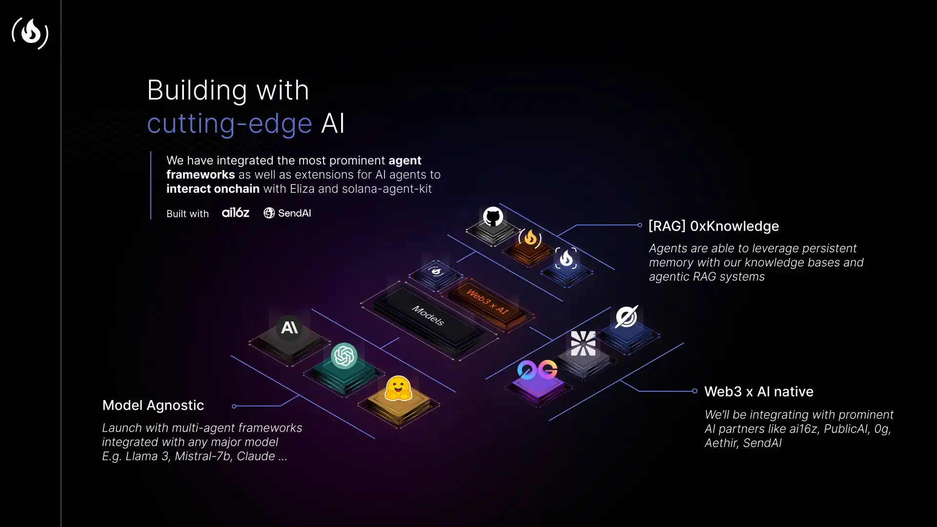 是一个专门为多 AI Agent 的蜂巢系统的信息学习做的发射平台和编排层,模块化 AI 区块链项目——0G LAB 体系内的 AI 基础设施。除了 0G 以外还与 ElizaOS 还有 SendAI 等架构合作让其能与更多的生态的 AI Agent 连接,因为项目本身搭建的模块化信息储存层,能让 AI 在读取需要的信息时比以往的 RAG 架构更快。作为**个在 SVM 上运行的架构,该架构在未来能在链上即时数据读取获得更快的响应速度。
