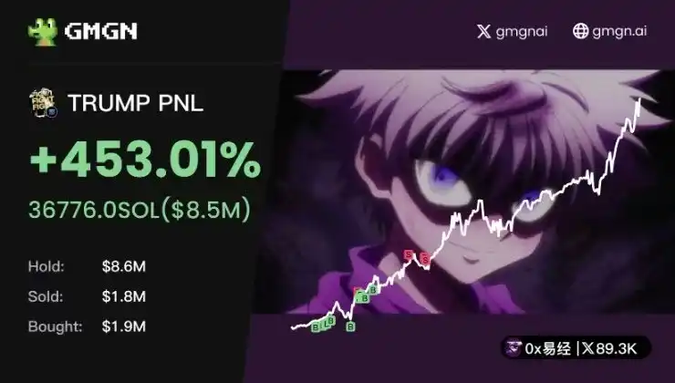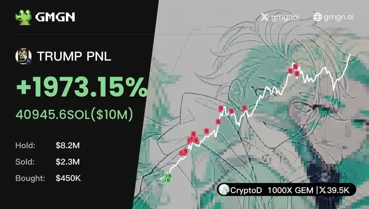 据 0x uezhang 丨 985.eth 本人于发推表示:「**时间用 gmgn 买上了(TRUMP),这个号靠 20 sol 成功打到了 1000 sol。」据 GMGN 网站信息显示,其盈利规模超 100 万美元。