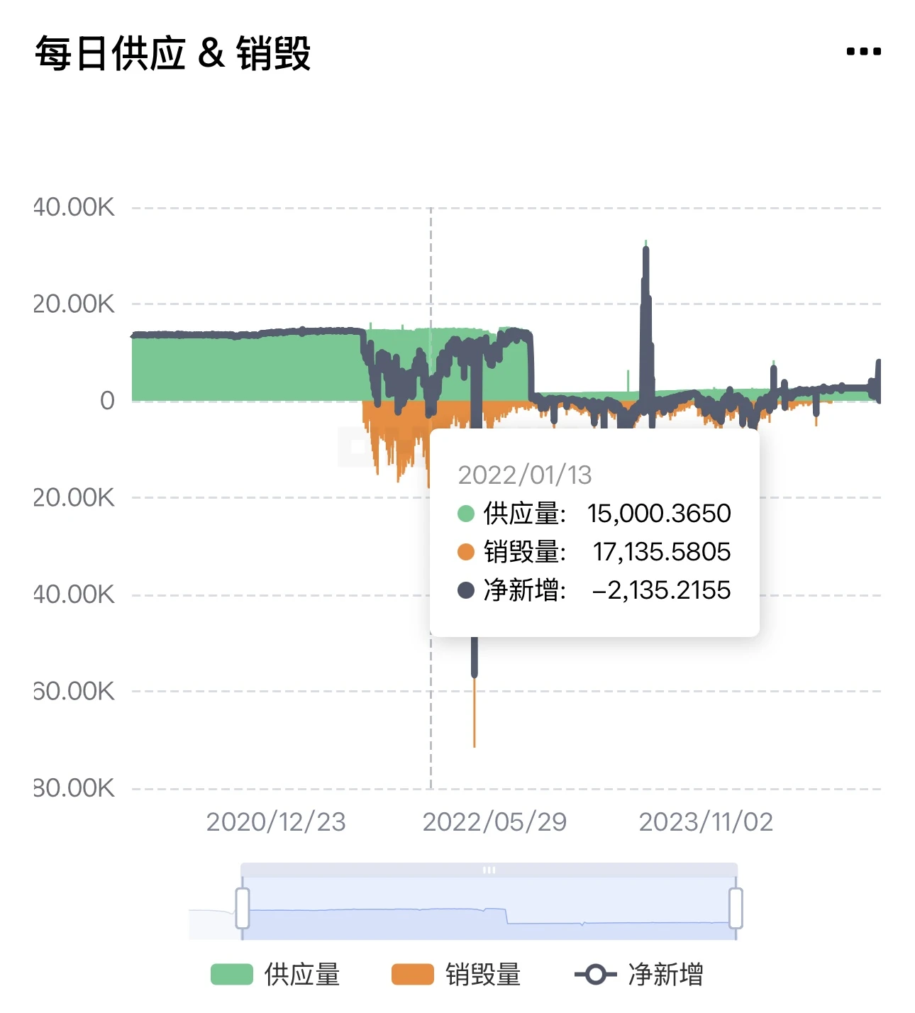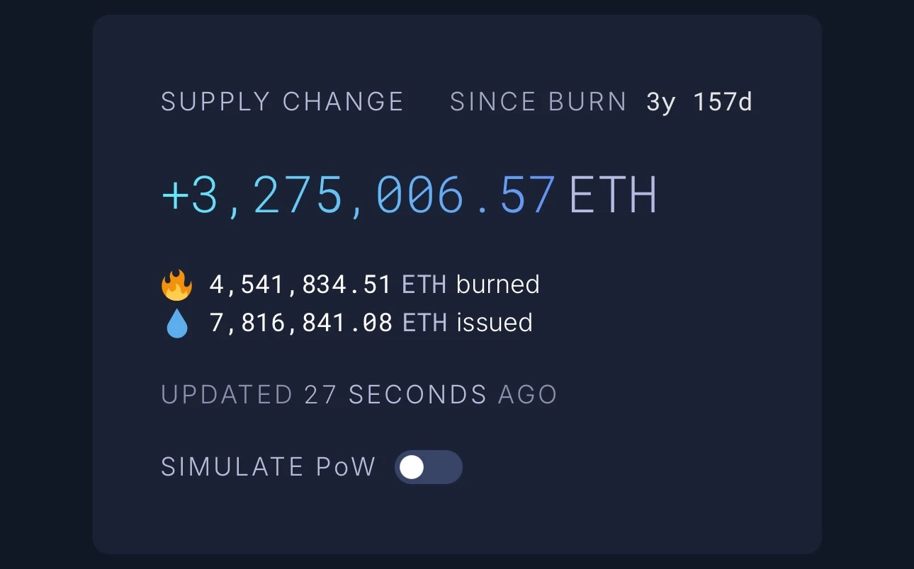 2. 从增发的角度来看, 2021 年 8 月 — 2022 年 9 月,这时仍然是 PoW 共识机制,新增发行 594 万枚。但从 2022 年 9 月转成 PoS 以来,仅新增发行了 187 万枚。