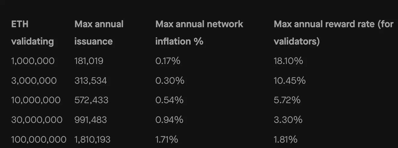 采用 POS 机制时,增发模型也随着改变:即质押验证者奖励,质押越多,收益率越少,质押越少,奖励越高,实现自我调节。