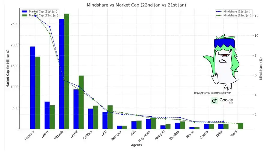 编者按:2025 年 1 月 22 日的 AI 代理市场呈现快速发展,主要代理如 Fartcoin、AIXBT、Virtuals 等占据 Mindshare 主导地位,但市值经历调整。特朗普宣布投资 5000 亿美元推动 AI 基础设施建设,预计将促进 AI 与加密货币融合。DeFAI 基础设施正在扩展,Griffain、Moby、HeyAnon 等代理推动自动化金融工具的发展。Virtuals 和 ARC 等框架继续吸引开发者,展示出强劲的市场潜力。