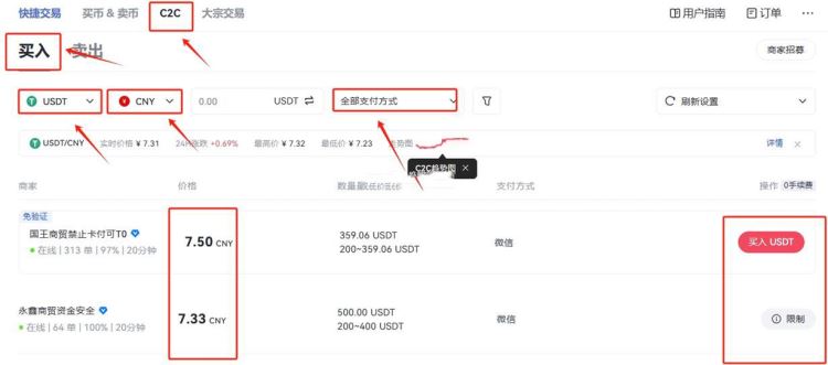 4、认证结束后,点击首页页面上方导航栏的“买币”——“法币交易”,购买货币之前通常需要购买**数量的USDT,以便交易。选择C2C,选择买币,选择USD,根据自己的需求选择合适的商家。