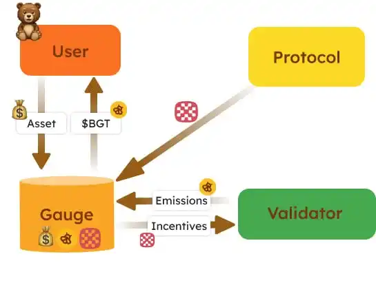 协议有兴趣创建自己的 Gauge(评估指标)并吸引流动性。它们分配给验证者的奖励越多,它们的流动性提供者(LP)就越能在$BGT 中获得回报。结果,更多用户希望成为协议的 LP,购买该项目的原生**,这也对其价格产生正面影响。这就像一个金字塔,每一层都覆盖着丰厚的甜蜜蜂蜜,确保所有参与者都能在过程中保持活跃。
