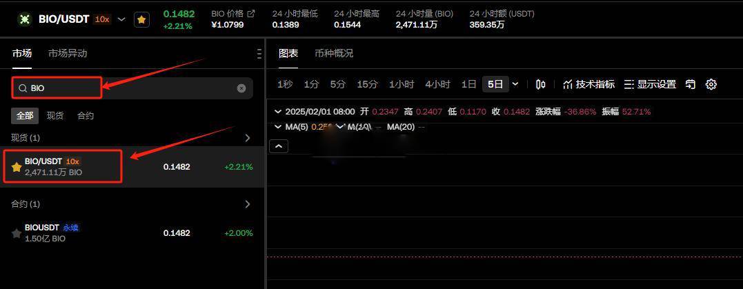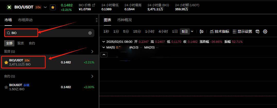 11、在搜索框输入BIO,选择BIO/USDT交易对,可以看到BIO实时行情
