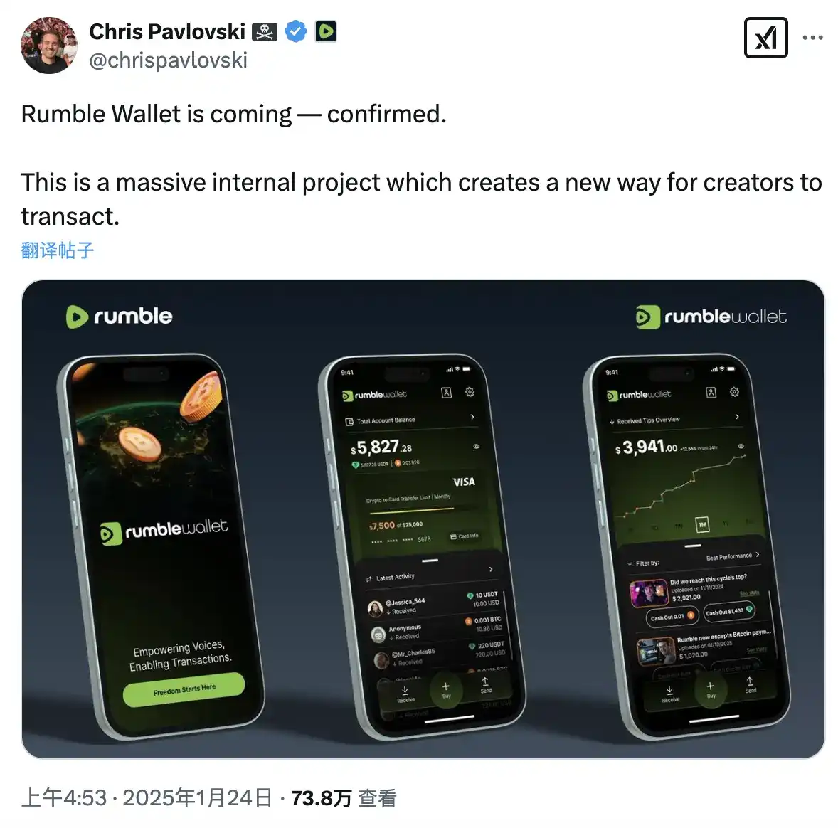 而在今年 1 月,Rumble 还宣布将推出支持比特币和 USDT 的加密钱包 Rumble Wallet,将为创作者提供新的交易方式。创作者可通过这两种加密货币接收粉丝打赏和订阅收入。Tether CEO Paolo Ardoino 就此表示,「Rumble Wallet 一个很酷的功能是使用 AI 代理/助手来帮助管理付款、根据过去的活动建议比特币储蓄策略、向最受关注的创作者进行打赏等。」