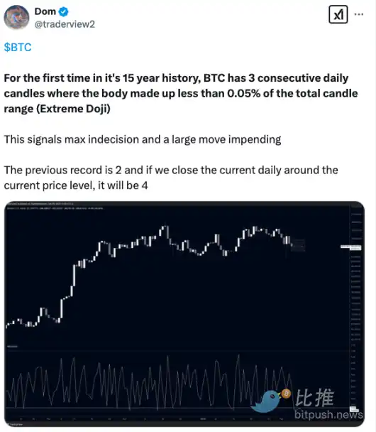 DOM 表示:「在比特币 15 年的历史中,**出现了连续三根『极端十字星』蜡烛图,每根蜡烛的实体部分仅占整个蜡烛范围的不到 0.05% 。这标志着市场极度犹豫不决,预示着即将出现大幅波动。」