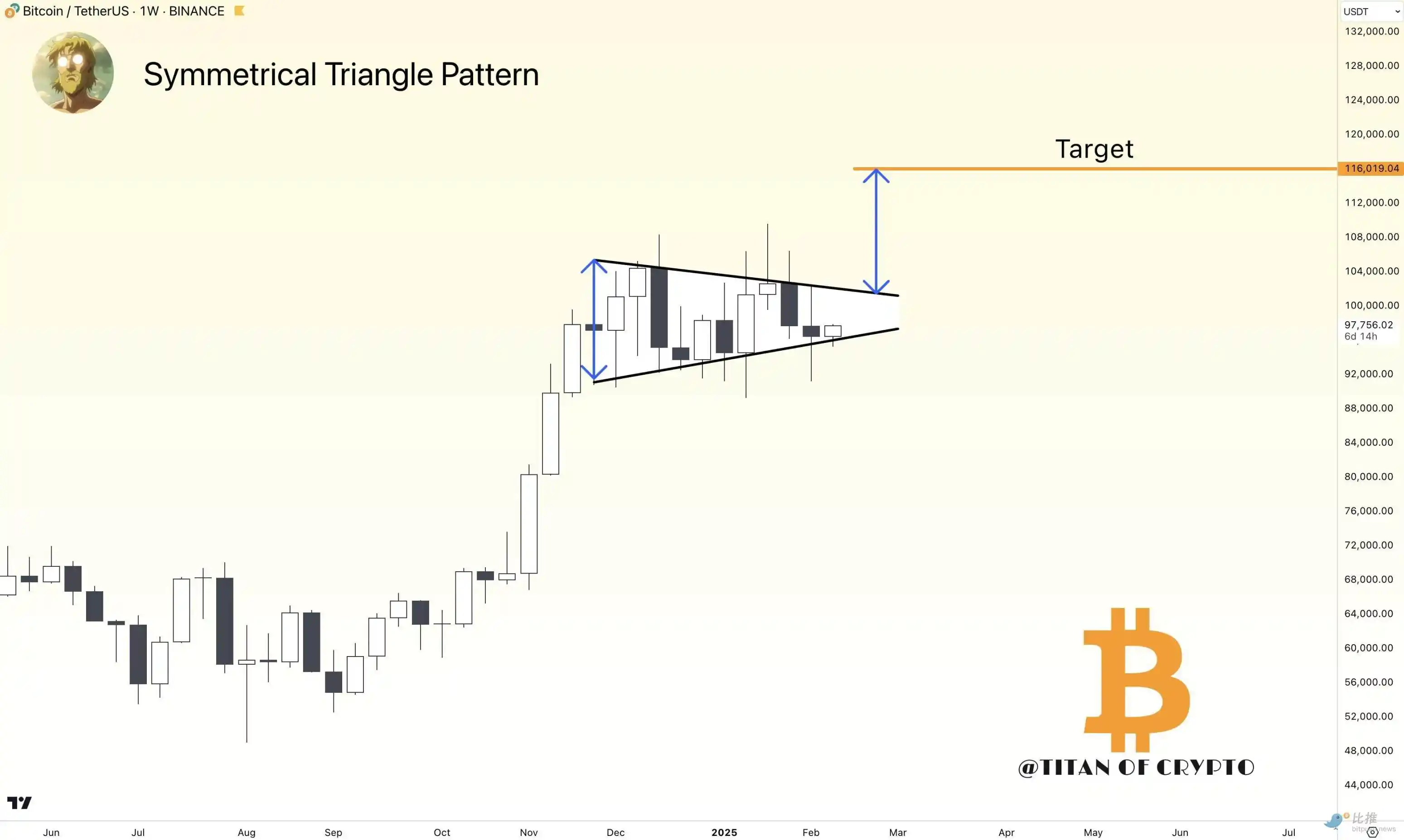 市场分析师 Titan of Crypto 指出,比特币价格有望突破三角形的上趋势线,并**达到 116, 000 美元的目标位。根据技术分析规则,上涨目标位的计算方式是将三角形上下趋势线之间的**距离与潜在突破点相加,这一方法为比特币的上涨目标提供了理论依据。