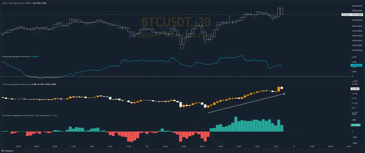 目前 93,000 美元到 98,000 美元之间的支撑还很坚固,暂时没有看到出问题的迹象,而且最近的 BTC 一直在 97,000 美元左右震荡,也未必就是件坏事,洗掉不坚定的筹码后,对于后市会更有帮助。