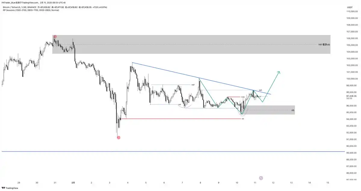 日线下跌,目前就是下跌趋势,空头为主。小时级别有概率向上掠夺流动性,上方目前构建 idm 流动性和 EQH 流动性,目前偏向向上做流动性获取。在上方目标需要一点点看,99,700 美元、 10,2000 美元 H4 看跌 ob 106,000 美元。这里合约需要看能否向下给个回踩获取下 965 这里 fvg 流动性 在 ob 吸筹买入 性价比更好。