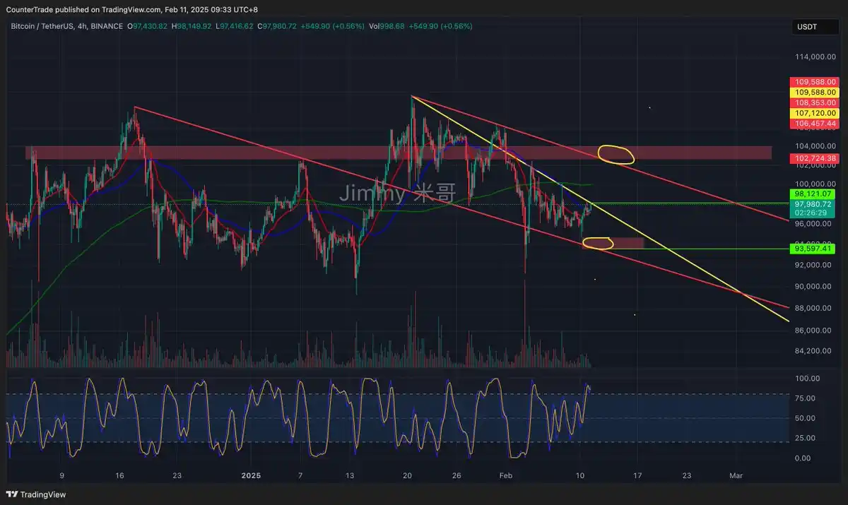 BTC 短期关键点位。受压黄色趋势线。4 小时压力位 98120,站上看 102-103k。受压回调看 93600 捕捉流动性。但不管直接上还是先下后上,102-103k 近期都是大概率要摸的。