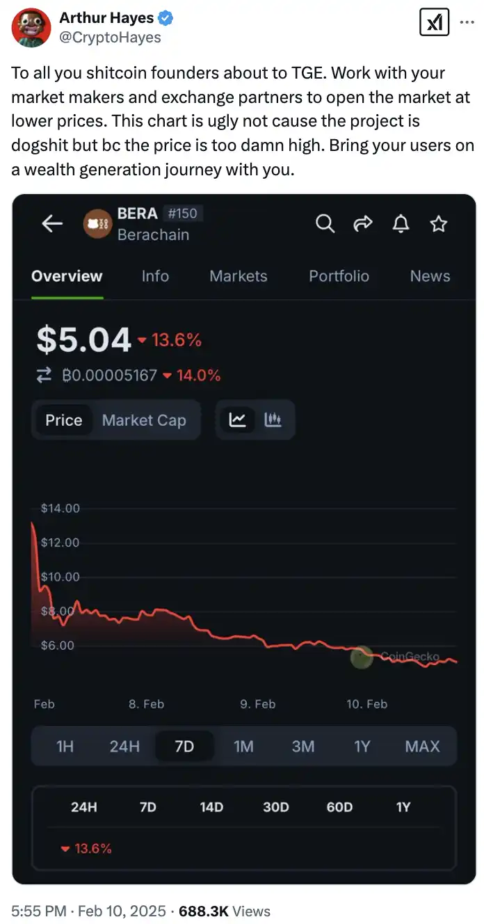 2. Arthur Hayes 建议创始人在 **E 时与做市商合作,以较低价格开启市场,吸引用户共同致富