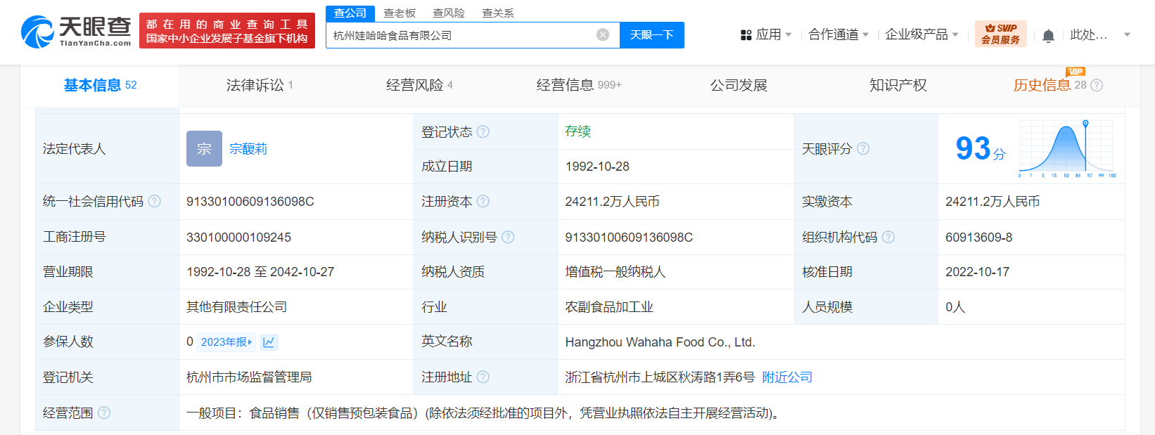 该公司成立于1992年10月,注册资本约2.42亿人民币,经营范围为食品销售。股东信息显示,该公司由杭州娃哈哈宏振投资有限公司、杭州娃哈哈集团有限公司、浙江娃哈哈实业股份有限公司共同持股。