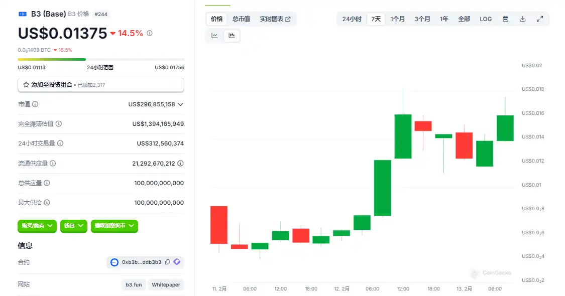 - B3 当前价格 0.014 美元,从 2 月 10 日上线时的低点 0.04 美元,飙到 2 月 12 日的**点 0.02 元,三天涨了快 400%,比你家楼下煎饼果子涨价速度还快;