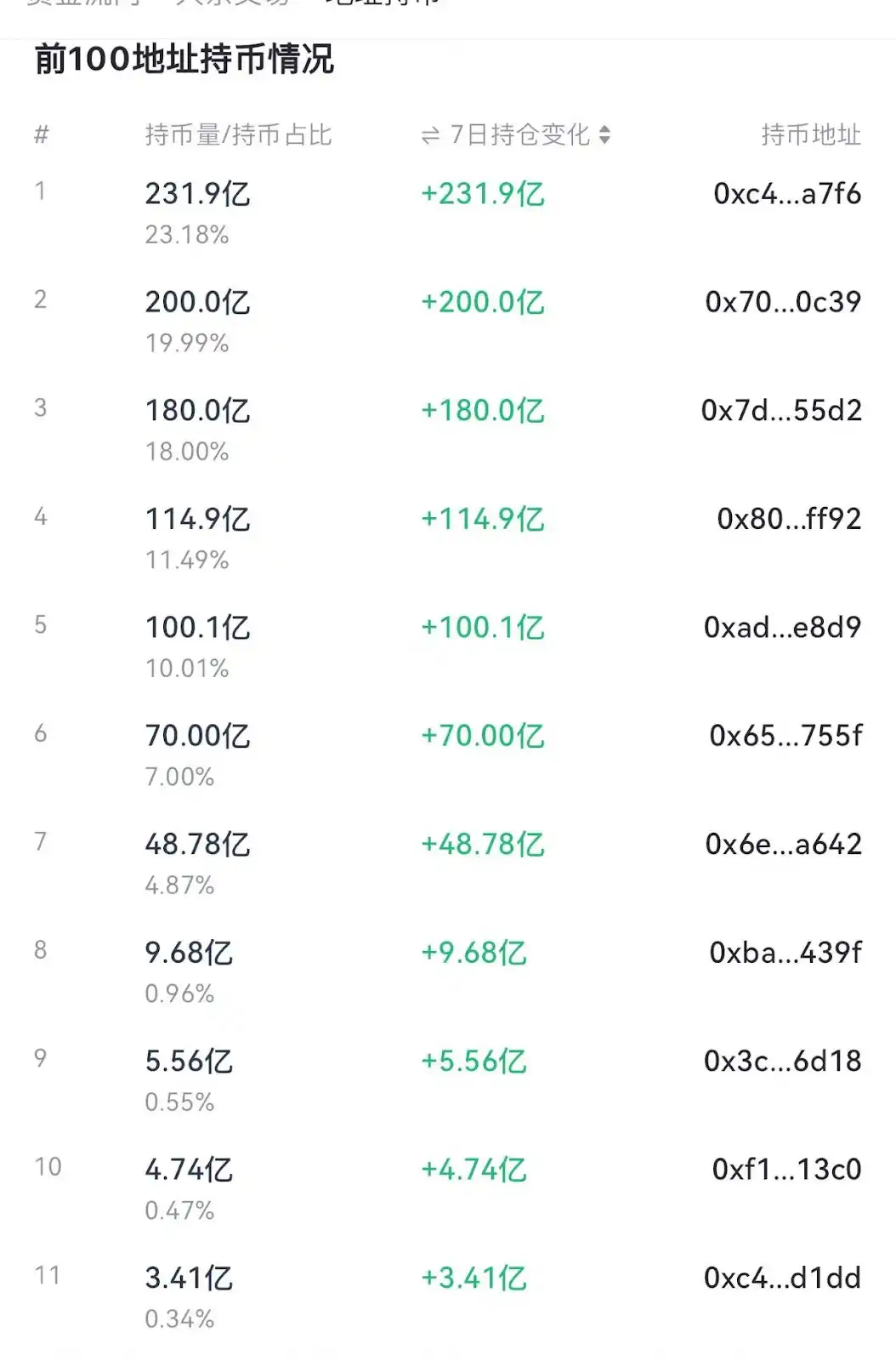 - 前 10 地址扣除掉交易所持有的**,总计 72%:妥妥的庄家控盘,价格涨跌全看大佬心情;