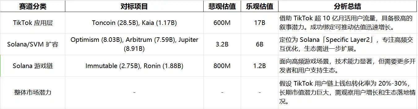 Sonic SVM 的估值可分为三个核心赛道:TikTok 应用层、Solana/SVM 扩容解决方案和 Solana 上的游戏应用链。通过对标行业内龙头项目的市值表现,Sonic SVM 的潜力逐渐清晰。