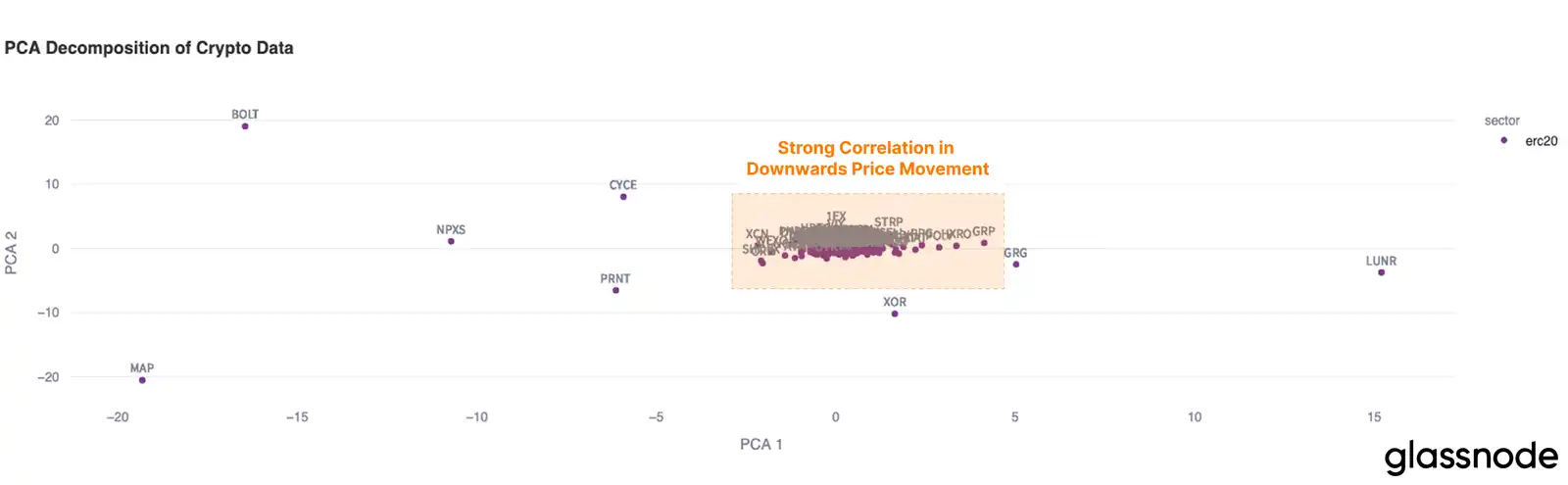 为了探索山寨币领域的下行价格走势,我们可以利用主成分分析 (PCA),将**回报的相关性投射到二维空间中。这种可视化有助于根据**的回报行为识别表现相似(聚集在一起)或不同(相距甚远)的**。