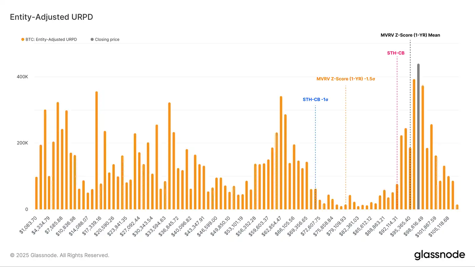 当将价格轨迹叠加到 URPD 成交量分布图上时,捍卫 STH 成本基础和 MVRV 1Yr Z-Score 定价区域的重要性变得越来越明显。在这些水平以下可以看到显著的成交量空洞,在这个价格范围内很少有**易手。
