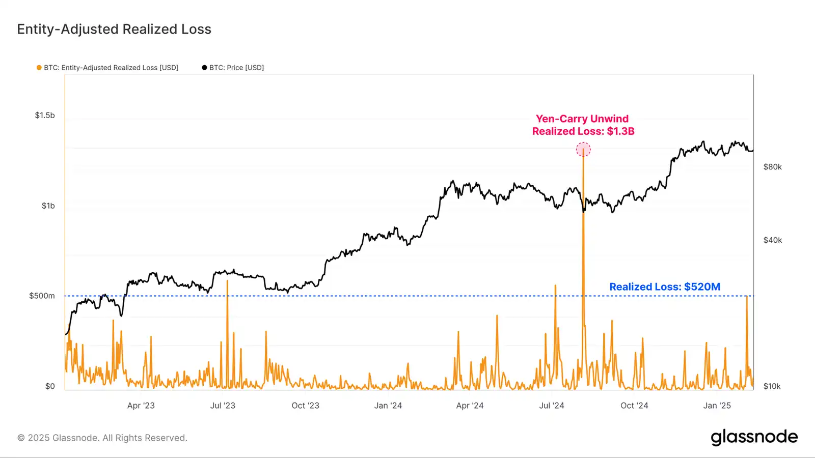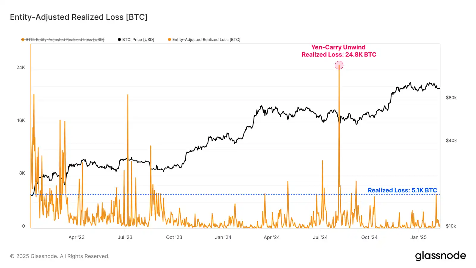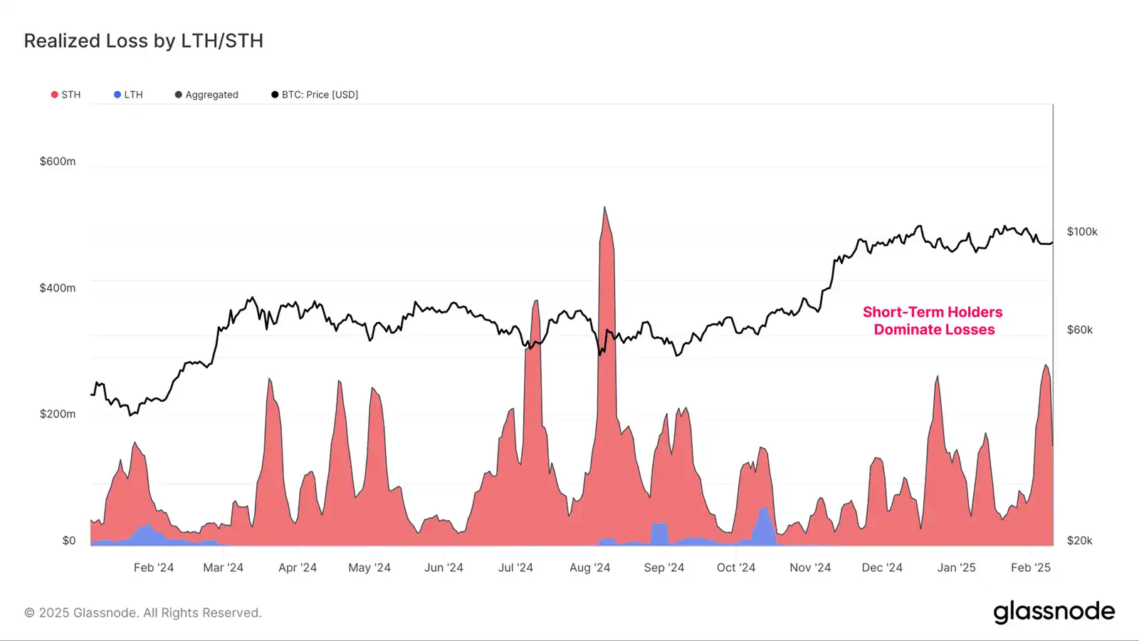 或者,相对对价格敏感的短期持有者往往会在牛市和熊市的下跌期间遭受巨额损失。本周短期持有者实体调整后的已实现损失总计 5.2 亿美元,与迄今为止整个 2024-25 周期的回调幅度相似。