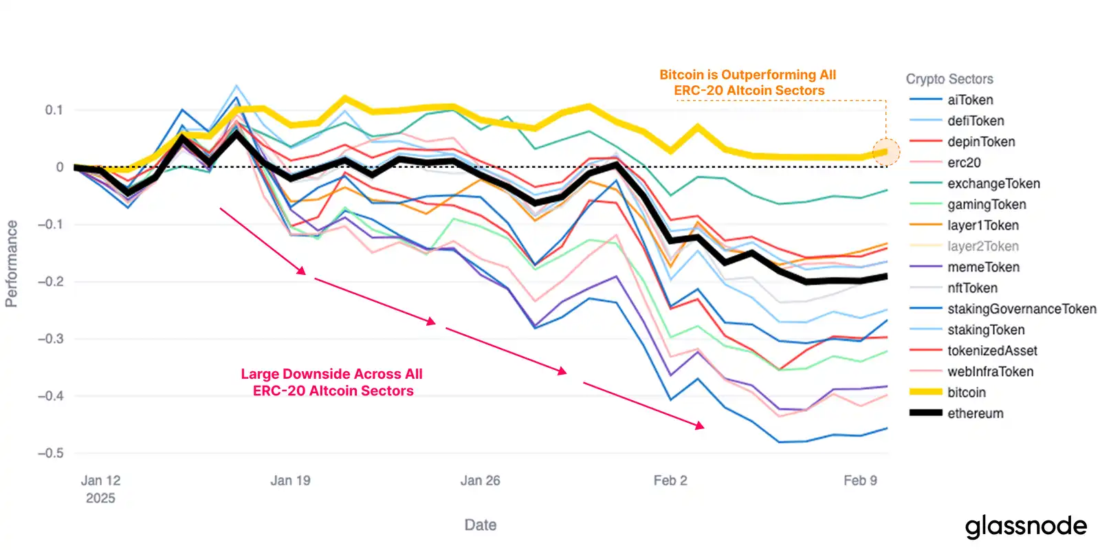 另一方面,山寨币行业经历了巨大的卖方压力,许多资产难以实现广泛采用或产品与市场的契合,这使得市场环境更加严峻。这**导致**价格大幅下跌,最近几周所有山寨币子行业的表现都不如比特币。