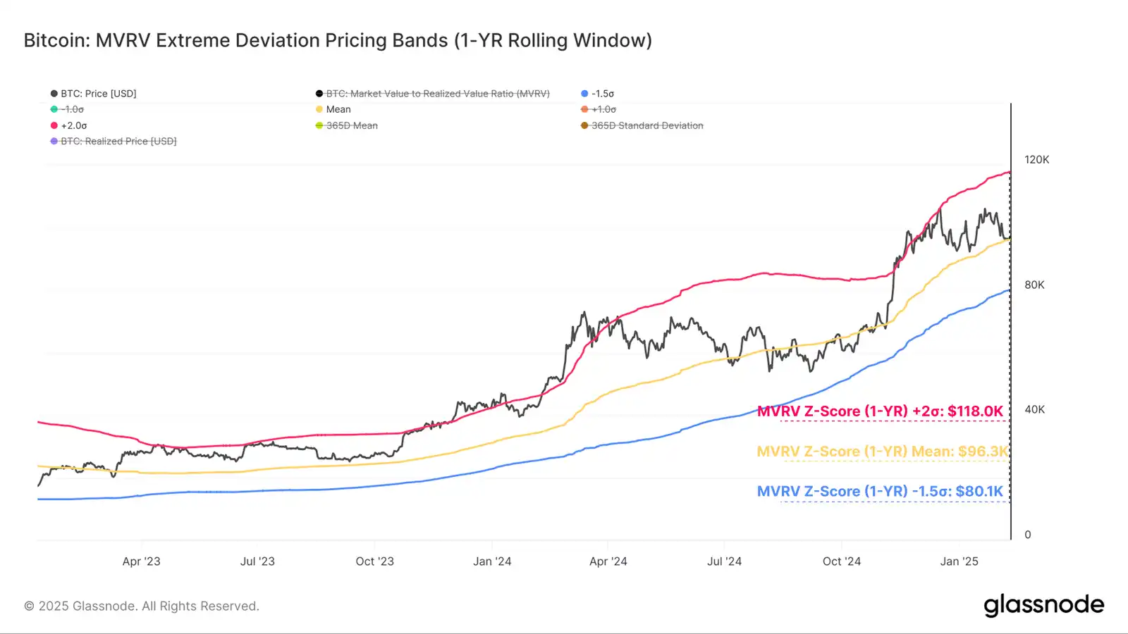 目前,价格在均线附近获得强劲支撑。如果价格跌破 -1σ 水平,则可能成为多头下一个主要防御支撑线的关键门槛。相反, 1σ 水平可能成为阻力位,因为投资者获得了大量未实现账面利润,并可能寻求将其兑现为市场力量。