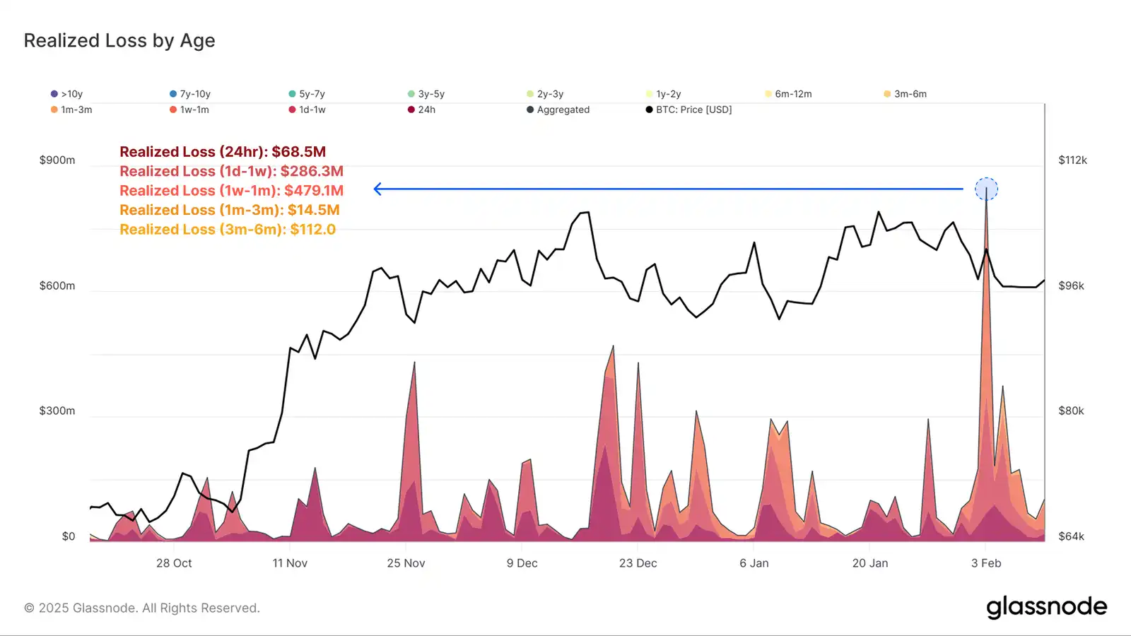 如果我们进一步分析短期持有者损失,就会发现大部分损失都与过去 1 个月内才购买**的投资者有关。按币龄细分如下: