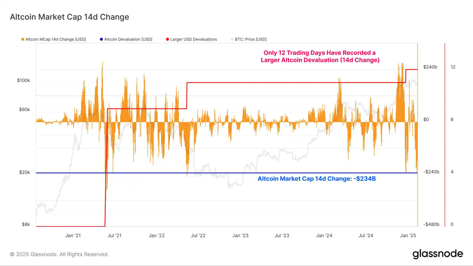 我们可以通过评估全球山寨币市值 14 天的变化来评估下跌的幅度。在过去两周内,山寨币市值下跌了 2340 亿美元,少数几天的**下跌幅度更大。