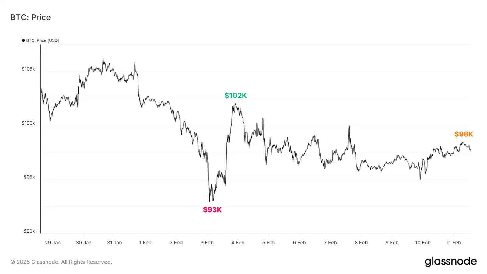 上周,比特币投资者经历了价格的剧烈波动。BTC 价格最初跌至 93,000 美元的低点,随后短暂回升至 102,000 美元,目前交易价格接近 98,000 美元。这种犹豫不决的价格走势主要是对特朗普总统威胁对加拿大、墨西哥和**征收关税的回应,这为投资者提供了不确定的宏观背景。除此之外,美元持续走强也导致流动性环境略显紧张。