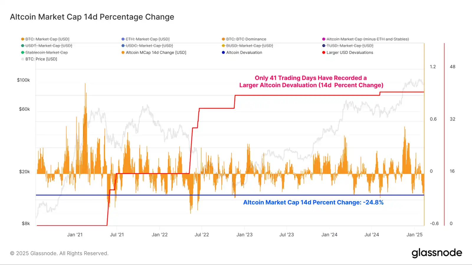 如果我们以百分比的形式来看待这一指标,山寨币的下跌仍然很显著,只有 41 / 1662 个交易日的下跌幅度更大。然而,在这个相对规模上,它确实与 2024 年全年经历的先前下跌事件更加一致。