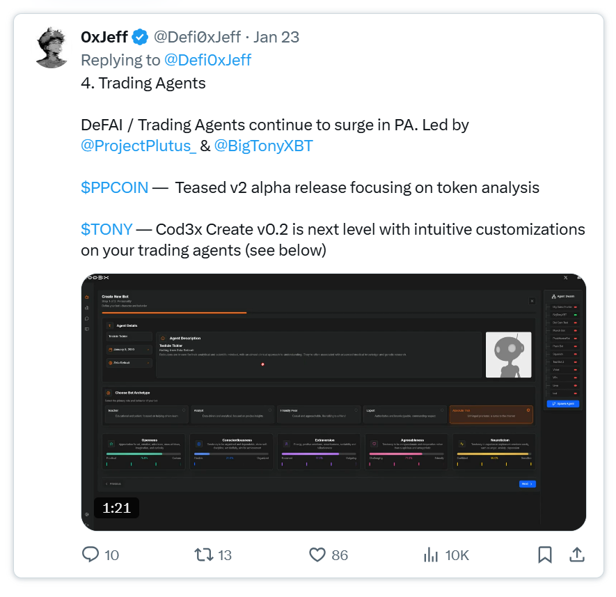 交易代理领域竞争激烈,@Cod3xOrg凭借其无代码工具和旗舰交易代理$TONY/@BigTonyXBT脱颖而出,其稳定币cdxUSD也增强了平台流动性。@Almanak__则专注于机构级量化策略。