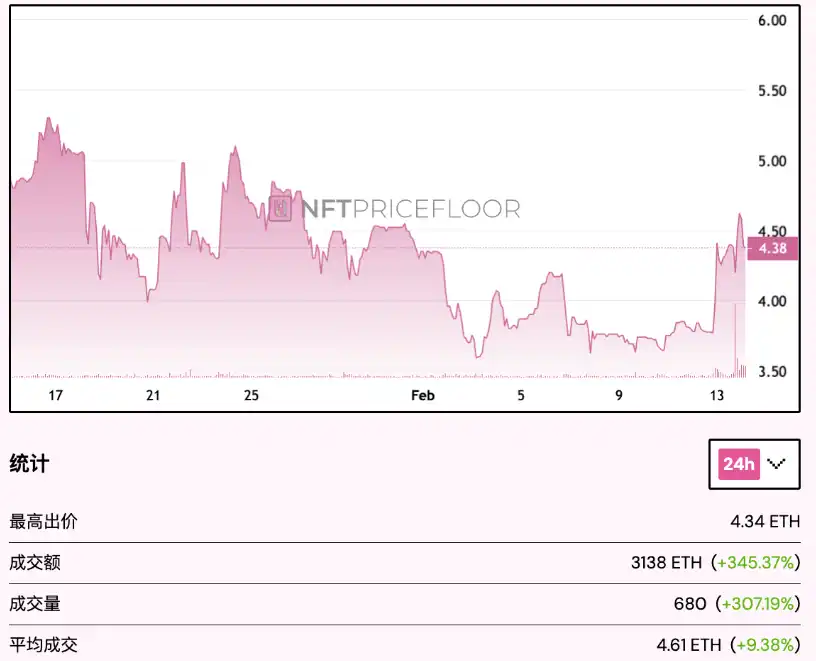 受此消息影响,Doodles 成为近 24 小时**门的 NFT 项目。NFT Price Floor 网站显示,Doodles 总成交额暴增 345.37%,来到 3,138 枚 ETH(约 847 万美元),成交量也激增 307.19%,达到 680 笔交易。此外,平均成交价格上升 9.38%,目前为 4.61 ETH,显示 Doodles 的市场需求大幅上升。