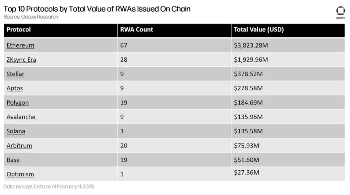 以太坊是发行**化资产的**区块链,其现实世界资产的总价值几乎是第二受欢迎的现实世界资产区块链——Stellar 的十倍。ZKsync 是以太坊构 L2 网络,其链上发行的现实世界资产数量和总价值均高于 Stellar。发行现实世界资产的前十大网络中,有六个是以太坊或以太坊 L2。