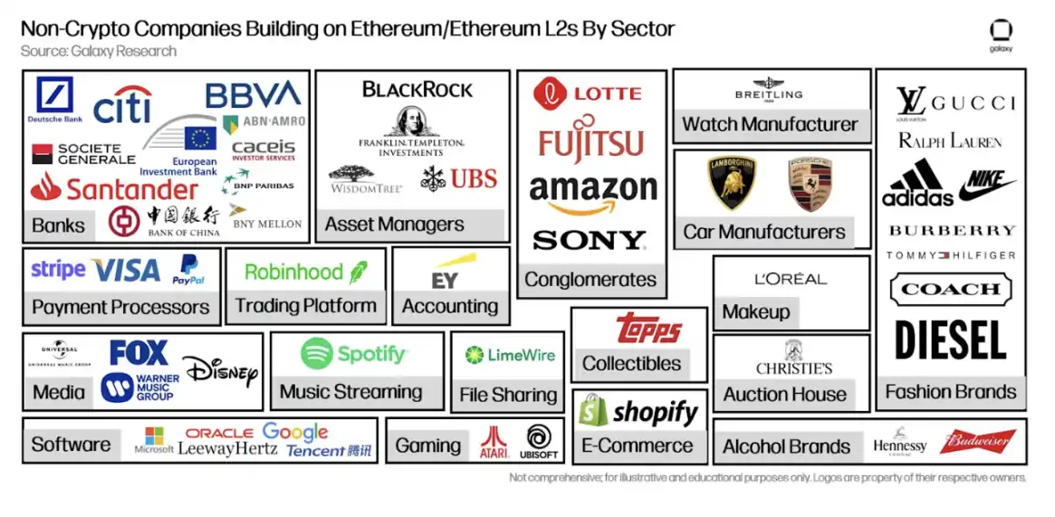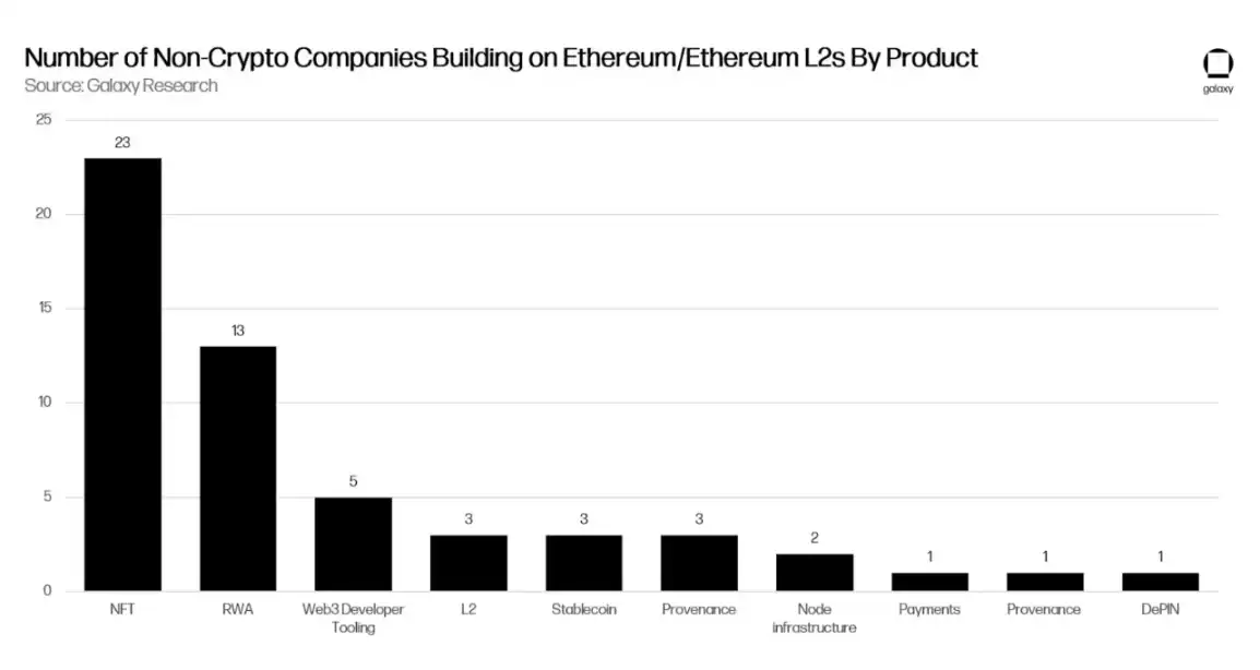如今,传统公司不再局限于扩展现有应用程序和服务套件来支持加密货币,而是积极创新只能通过区块链实现的新产品和服务。此外,这些公司中至少有 55 家正在以太坊等公共区块链以及 Polygon、Arbitrum 和 Base 等以太坊二层网络上进行建设。