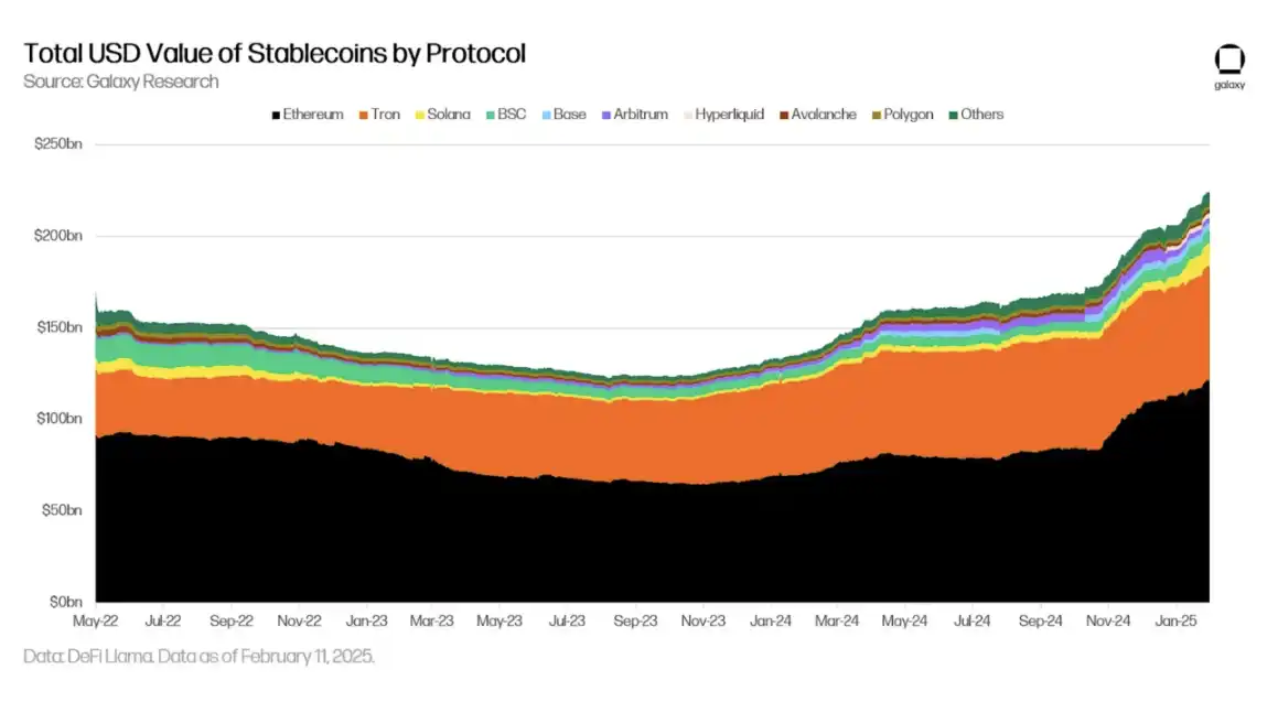 以太坊上稳定币的总流通供应量在过去一年中增长了 70%。这些稳定币在抵押品组合和设计类型上各有不同,但绝大多数是与美元挂钩的工具,并以高质量流动资产作为抵押。截至 2025 年 2 月 11 日,以太坊在稳定币市场总份额中占比超过 50%。