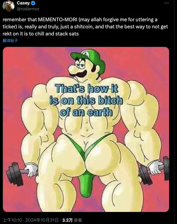 在 MEMENTO•MORI 铸造开始后,Casey 在 X 平台再次发布免责声明,强调 MEMENTO•MORI 无**价值,只是一个“垃圾币”。