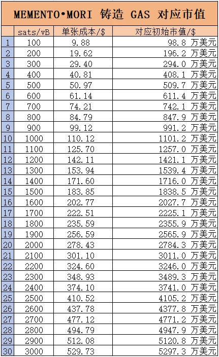 基于 Casey 在比特币生态中的“地位”和影响力,并且 MEMENTO•MORI 从某种意义上来说是其**个属于自己的符文,因此社区预期铸造开始时,比特币网络手续费将被抬高至四位数。根据比特币生态博主CG的成本预测,若铸造网络手续费超过 1000 聪/字节,MEMENTO•MORI 单张成本将达到 110 美元,初始市值将超 1000 万美元。