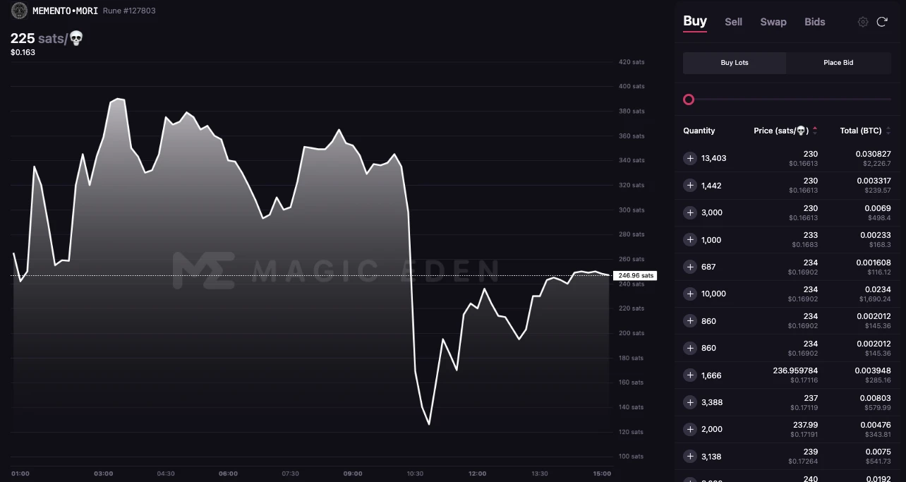 Casey 完成这次空投手续费约花费了 3.1 万美元,而根据 Magic Eden 的数据,在空投完成后,MEMENTO•MORI 的地板价和交易量飙升,**单价突破了 400 sats,一张价值超过 350 美元,与** 5 美元的参与成本相比,已经获利几十倍。