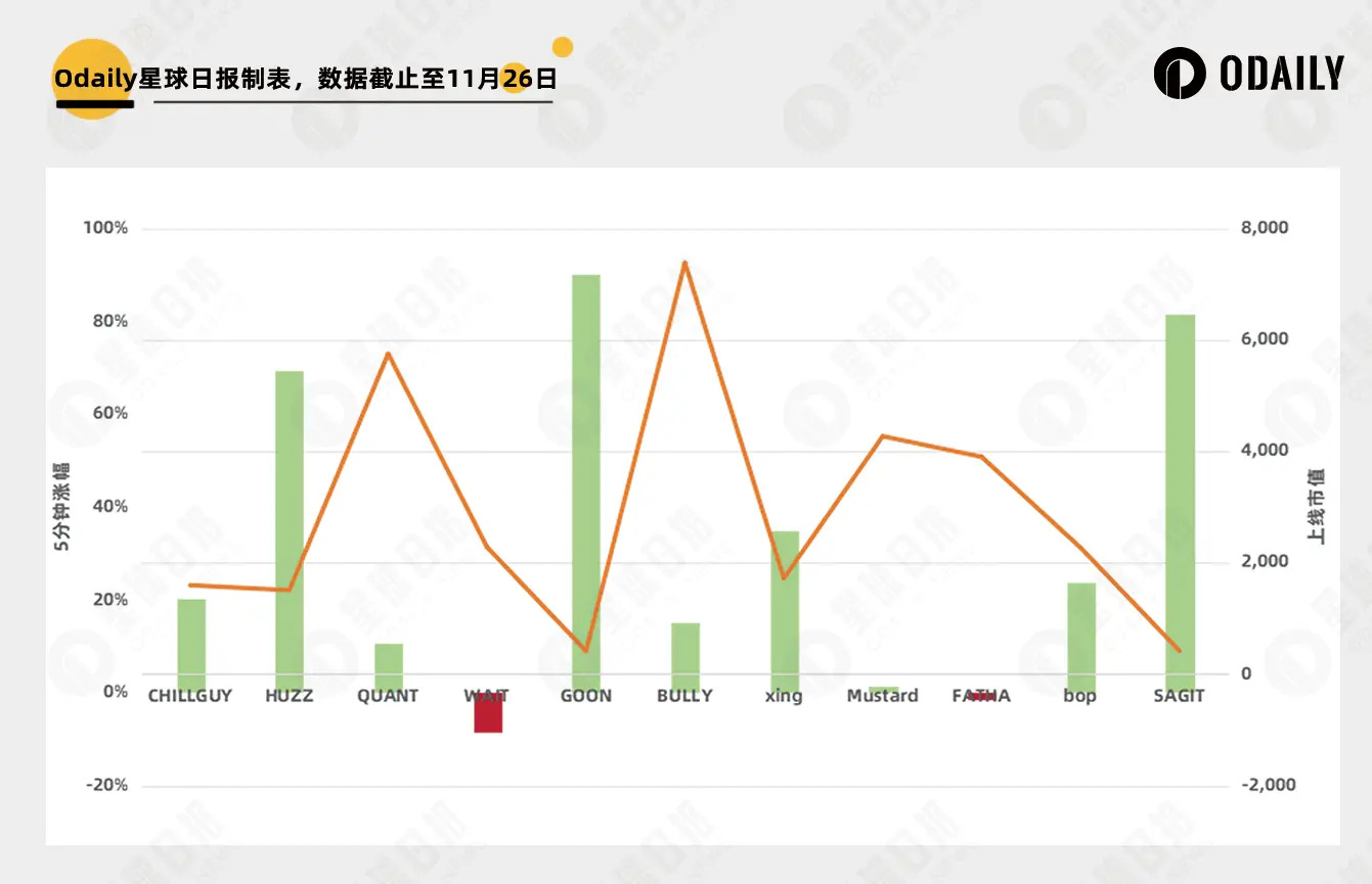4小时与24小时涨跌幅如下图所示(除CHILLGUY涨幅过大外不再显示),各**涨跌开始分化,但多数“破发”并持续下行,到了24小时阶段10个**中有6个下跌,不计CHILLGUY的4小时平均涨幅为5%,24小时涨幅为-2%。