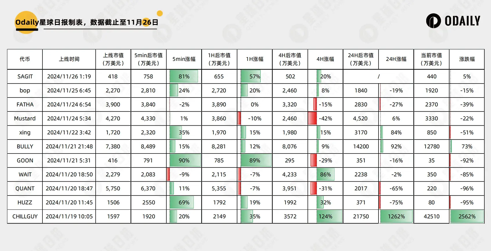 而近一周上线的11个**5分钟、1小时、4小时、24小时和至今涨幅如下图所示。
