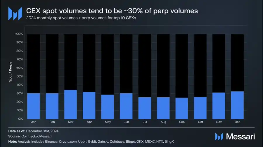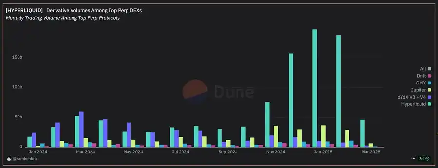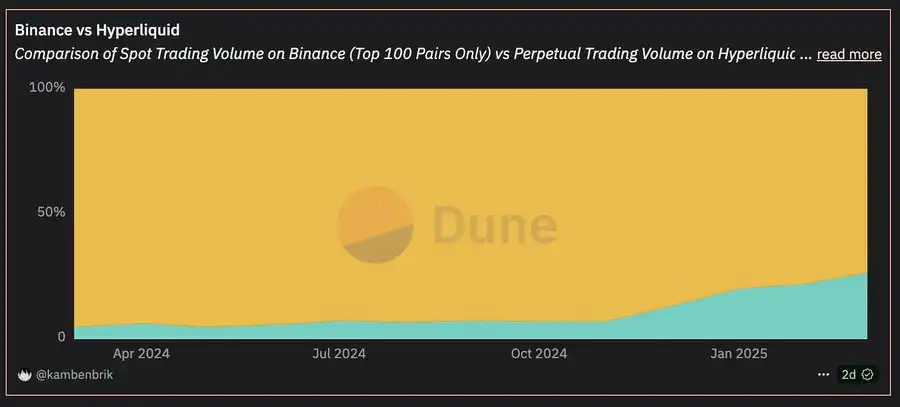 ·尽管 Hyperliquid 仍然小于像 Binance 这样的** CEX,但它在某些月份缩小了差距,到了 2025 年 3 月,它的交易量占比超过了展示的总交易量的 26%(与 Binance 前 100 的现货交易对相比)。这一比较强调了一个链上高性能的永续合约交易所能够有效挑战甚至是主导的**化现货市场。