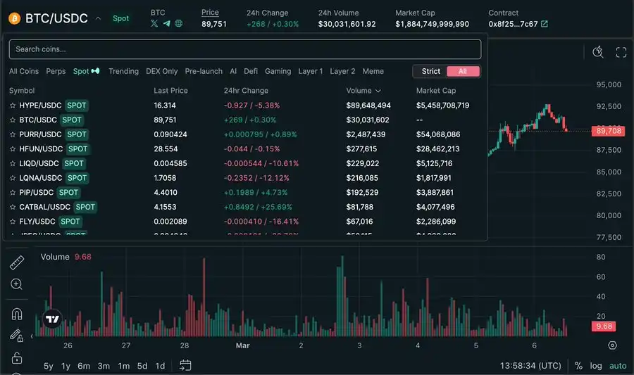 相比于 Hyperliquid 庞大的 1.06 万亿美元永续合约市场,现货交易起步较小,但增长迅速。截至 2025 年初,随着关键更新(尤其是 BTC 的上线),Hyperliquid 正在逐步成为链上现货交易的**竞争者。