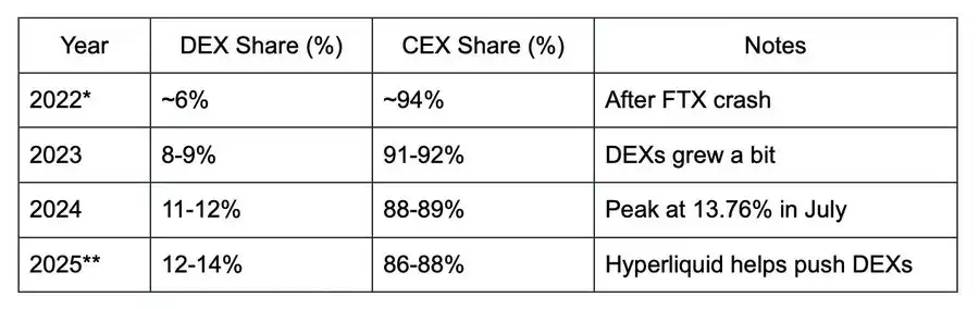 2022 年指 FTX 崩盘后(11 月至 12 月)。2025 年数据为截至 3 月 6 日的预估值,Hyperliquid 意识到了这一短板:如果用户体验不佳或流动性不足,用户不会大规模迁移到链上。因此,团队致力于打造「CEX 级别的速度和流动性,但**链上化。」